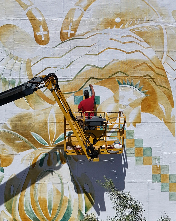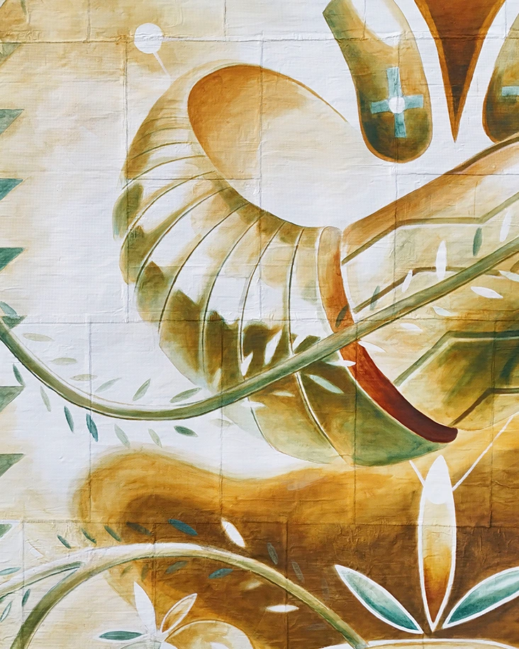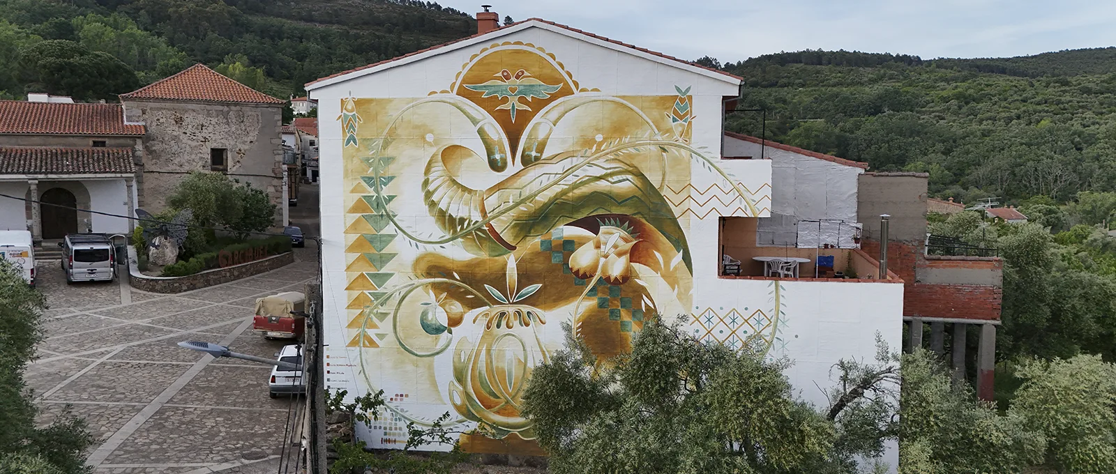 El proyecto parte del estudio de los patrones, símbolos y estructuras formales del bordado local, trasladándolos al espacio arquitectónico mediante una composición mural desarrollada en su mayor parte con pigmentos minerales recolectados en el propio municipio.