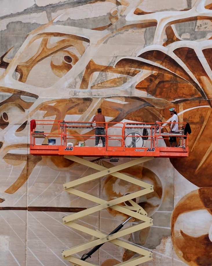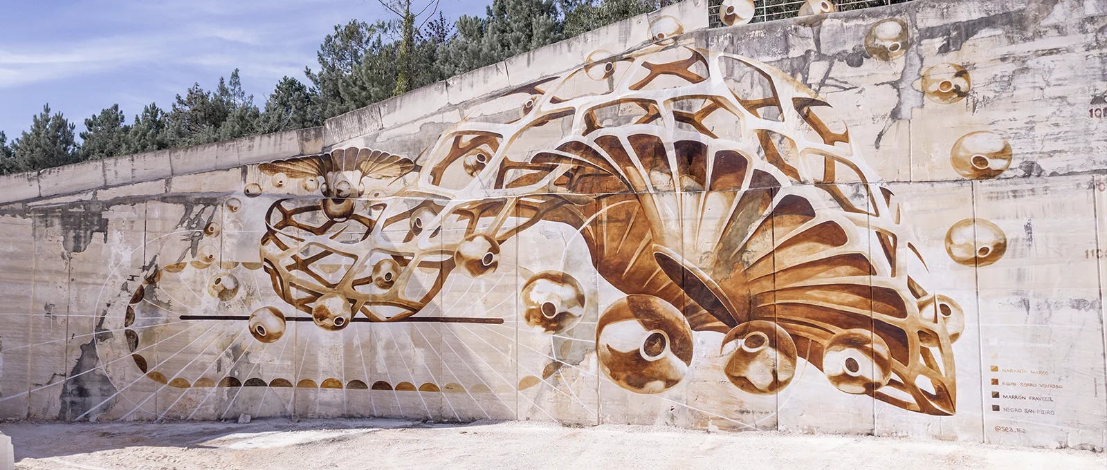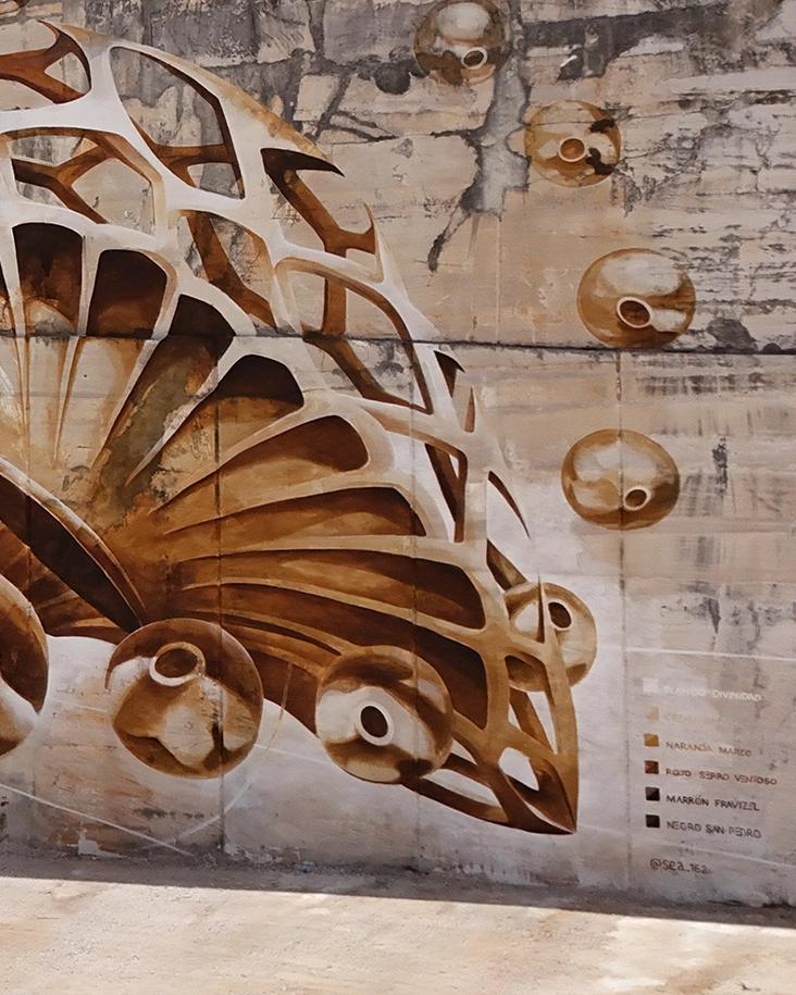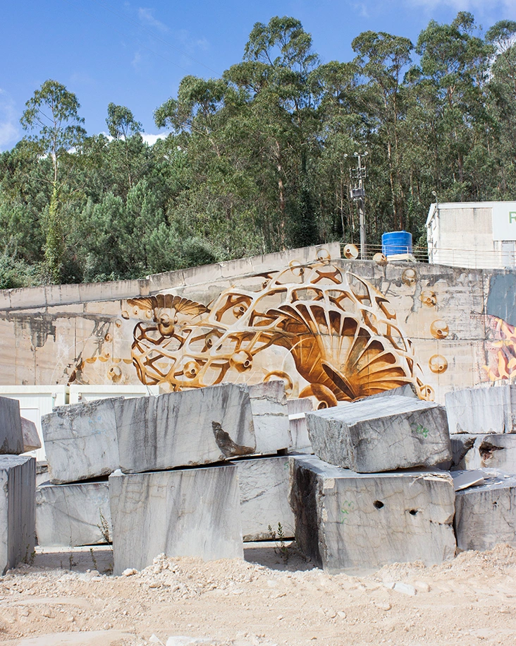 Intervención mural realizada en una cantera de piedra caliza en Porto de Mós, utilizando pigmentos minerales recogidos en el propio territorio. La pieza emerge como una arquitectura orgánica suspendida sobre la piedra, donde formas celulares y esféricas flotan entre las vetas calizas. El mural actúa como una extensión del paisaje: un puente entre materia geológica y gesto humano.