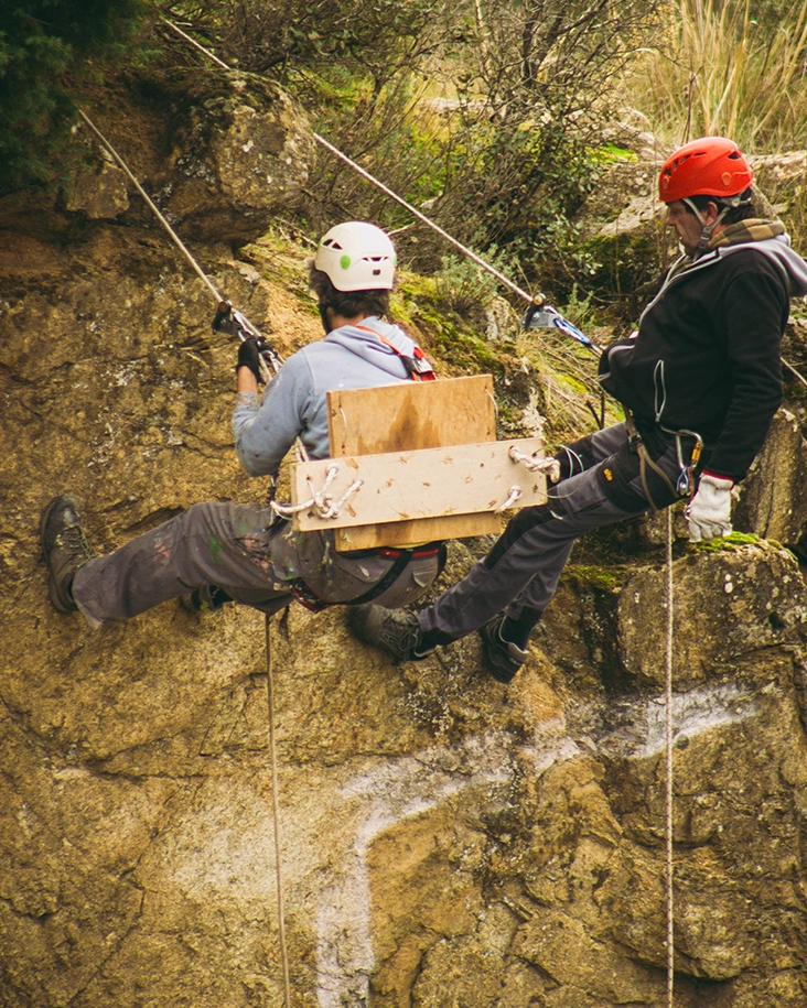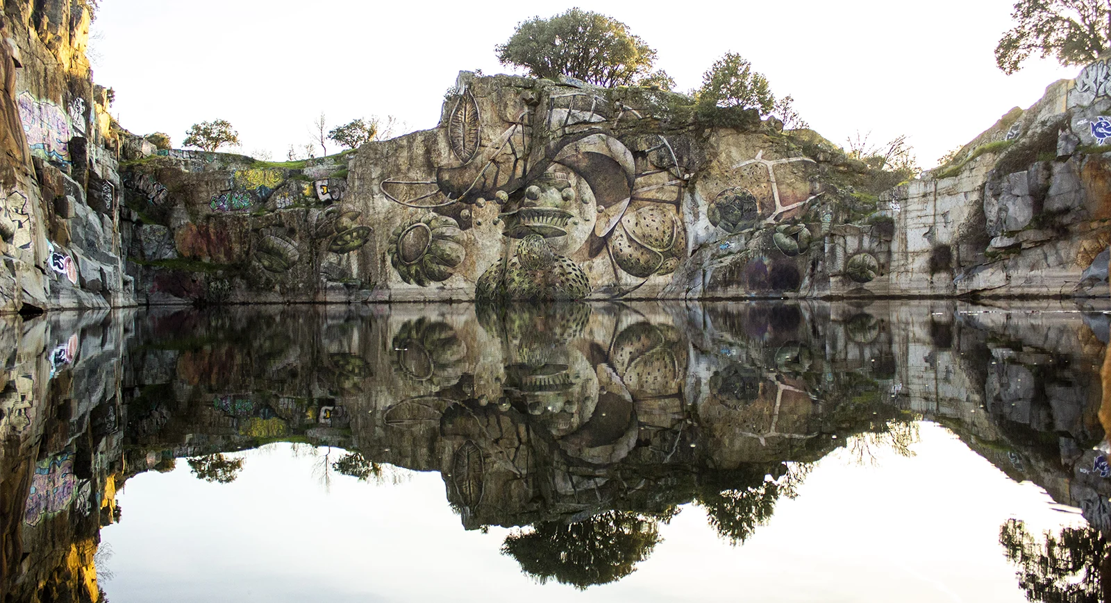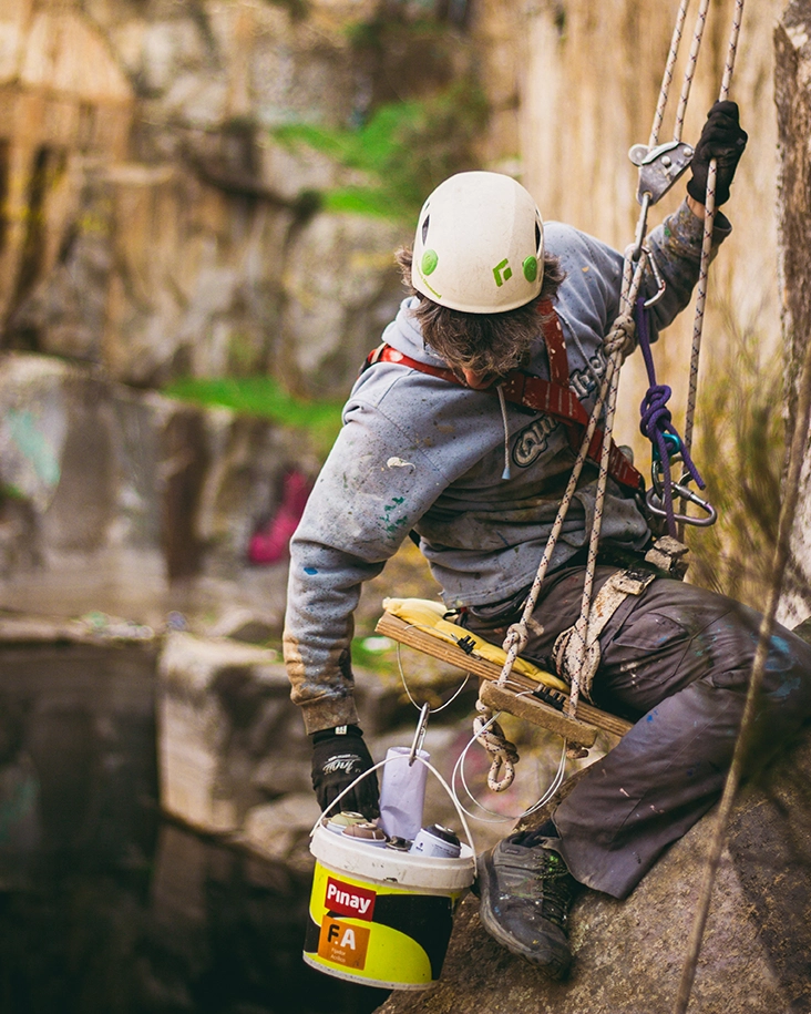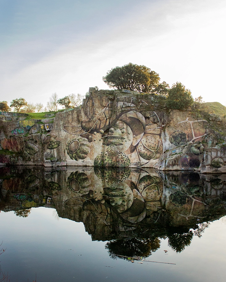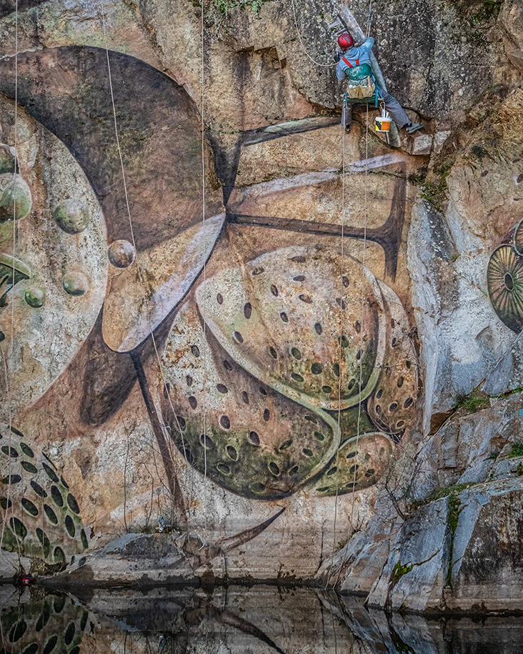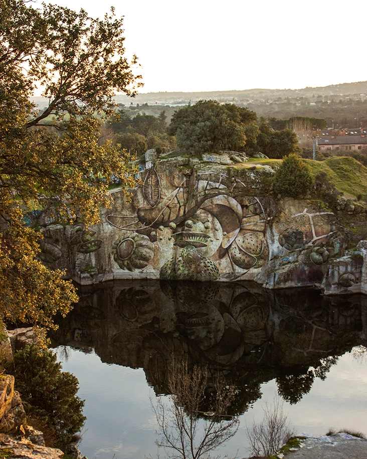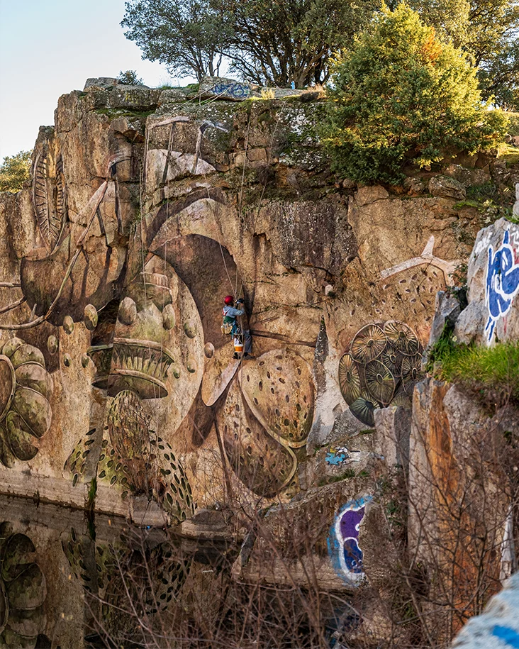 Intervención realizada en una cantera abandonada en Alpedrete, desarrollada sobre una superficie rocosa que emerge del agua.