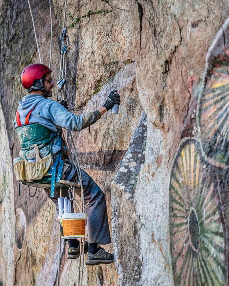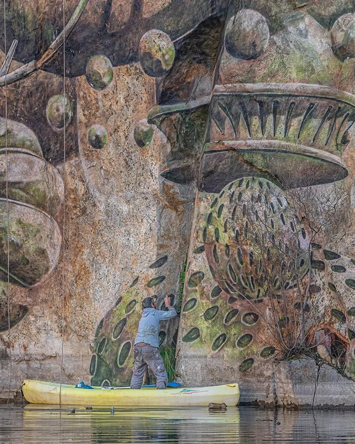 La obra representa a escala monumental una estructura microscópica, trasladando una forma científica al contexto geológico. La composición se adapta a la morfología de la roca, incorporando textura y relieve como parte estructural de la pieza.